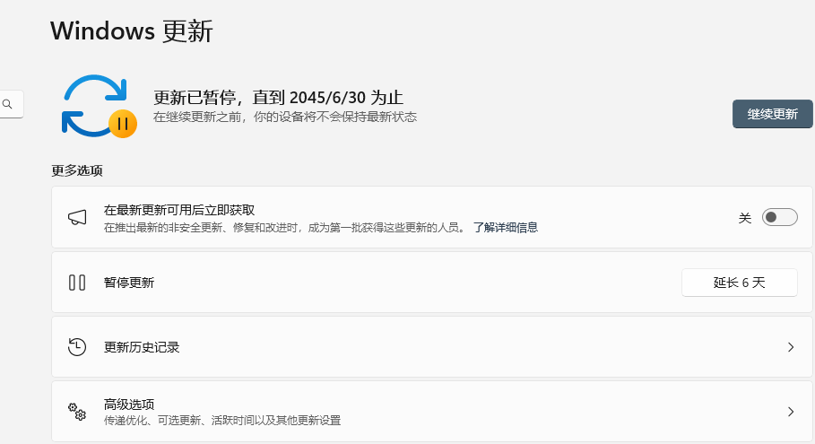 重启后再次设置-Windows更新,暂停更新就可以下拉选择了,选择最长的时间。